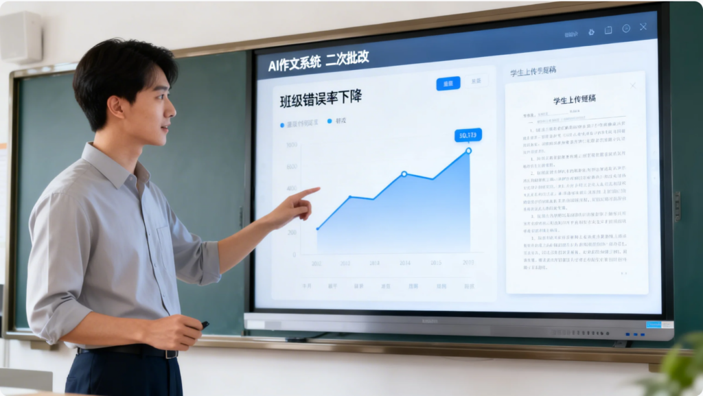 学生结合所学优化作文后,将终稿上传 AI 作文系统。二次批改数据显示,动词类错误、句式单一等问题发生率显著下降。教师结合数据总结班级进步点与待改进问题,为每位学生提供个性化反馈。